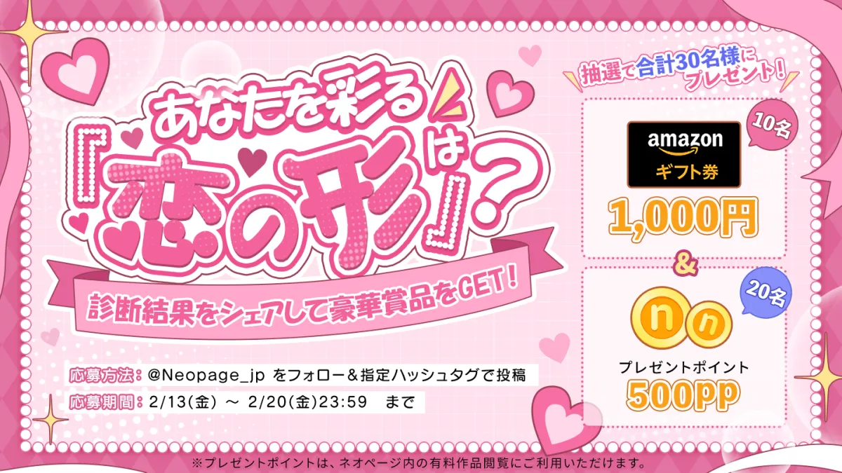 WEB小説投稿サイト「ネオページ」では、2026年2月13日から20日までの期間限定で、バレンタインシーズンに関連した特別なキャンペーン「バレンタインに愛の物語を」を開催します。この企画は、女性向けの人気恋愛作品を中心にしたもので、参加することで魅力的なプレゼントを手に入れるチャンスもあります。