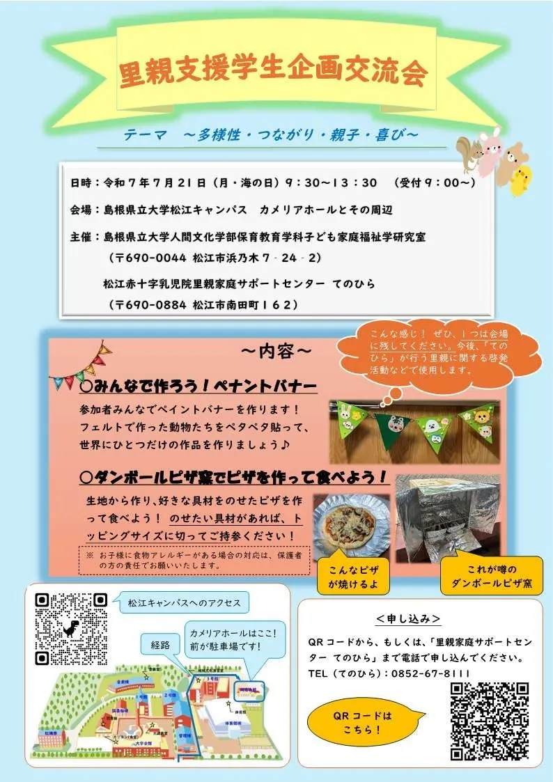 島根県立大学の保育教育学科と「松江市赤十字乳児院里親家庭サポートセンターてのひら」が共に開催する「里親支援学生企画交流会」が、今年の7月21日(海の日)に行われます。本イベントは、里親制度や養子縁組に関心のある島根県立大学の学生を対象とし、テーマは「多様性・つながり・親子・喜び」となっています。この機会に、さまざまな価値観を持つ人々との出会いや交流を楽しんでみてはいかがでしょうか。