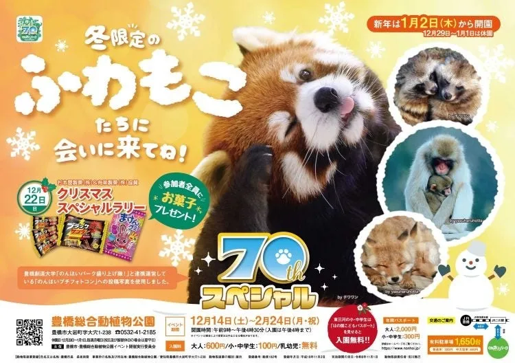 のんほいパークは年末は12月28日まで開園しています。そして、新年は1月2日から開園。動物たちとふわもこなひとときを楽しむにふさわしい冬のイベントが目白押し。ぜひ家族や友人とともにお出かけください。この特別な冬のひとときを心ゆくまで味わってください!