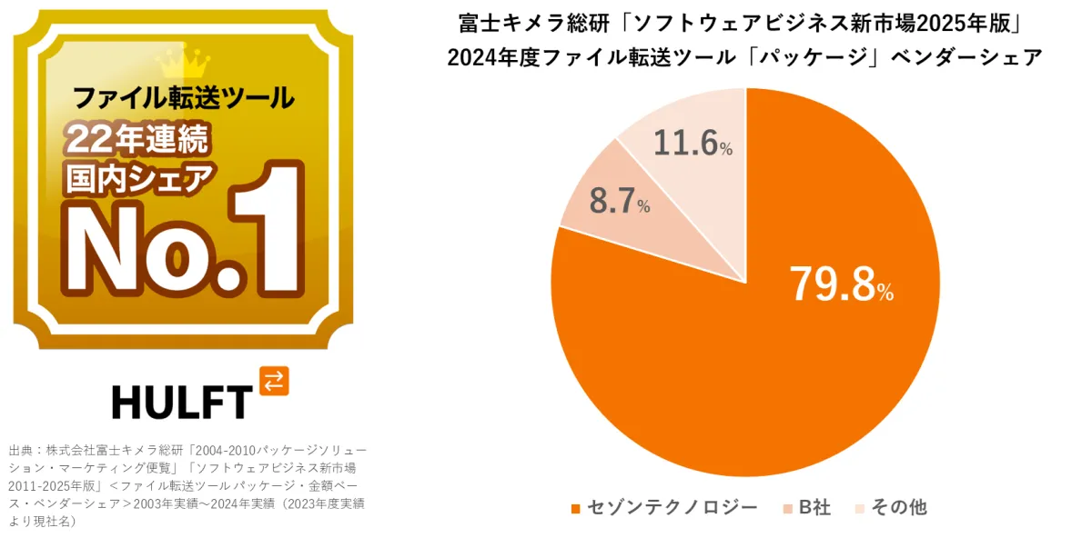 株式会社セゾンテクノロジー(東京都港区、代表取締役社長:葉山 誠)は、2025年7月に発刊される富士キメラ総研の「ソフトウェアビジネス新市場 2025年版」において、ファイル転送ツール分野パッケージカテゴリーで2024年度に国内市場ベンダーシェア1位を獲得したことを発表しました。これは、同社が22年連続でトップの座を維持することを意味しており、その実績は多くの業界関係者から高く評価されています。