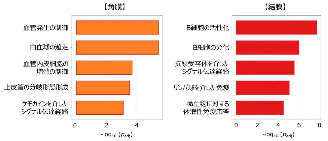 結膜では、細胞間の結びつきが弱まり、バリア機能に関連する遺伝子の発現が低下することがわかりました。これにより、外部からの細菌などに対する防御力の低下が考えられます。