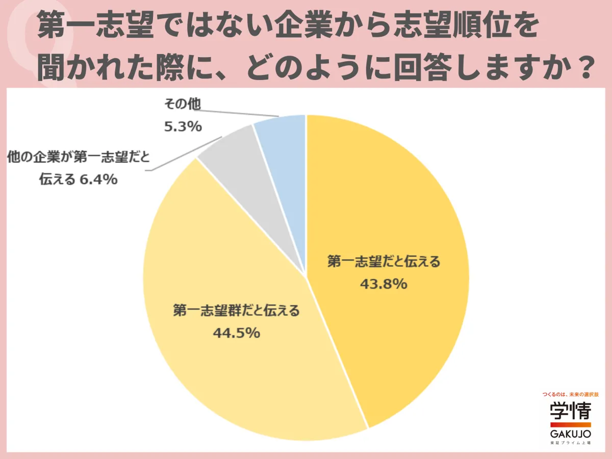 株式会社学情が2026年に卒業予定の学生を対象に実施したインターネットアンケートによると、就職活動において学生たちは新たな戦略を採用していることが明らかになりました。特に、第一志望ではない企業について尋ねられた場合「第一志望群だと伝える」という回答が44.5%を占め、従来の「第一志望だと伝える」の43.8%を上回る結果となりました。