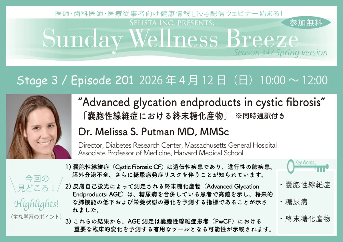 2026年4月12日(日)に、セリスタ株式会社が主催する無料のZoomオンラインセミナーが開催される。講師には、マサチューセッツ総合病院のDr. Melissa S. Putman MD, MMScが招かれ、『Advanced glycation endproducts in cystic fibrosis』というテーマで講演が行われる。