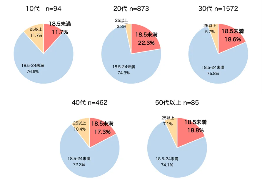調査では、年代ごとの痩せ率を示しています。10代11.7%、20代22.3%、30代18.6%、40代17.3%、50代以上18.8%と、若い世代での痩せが目立っています。これらのデータは、女性の健康問題を一層際立たせるものです。