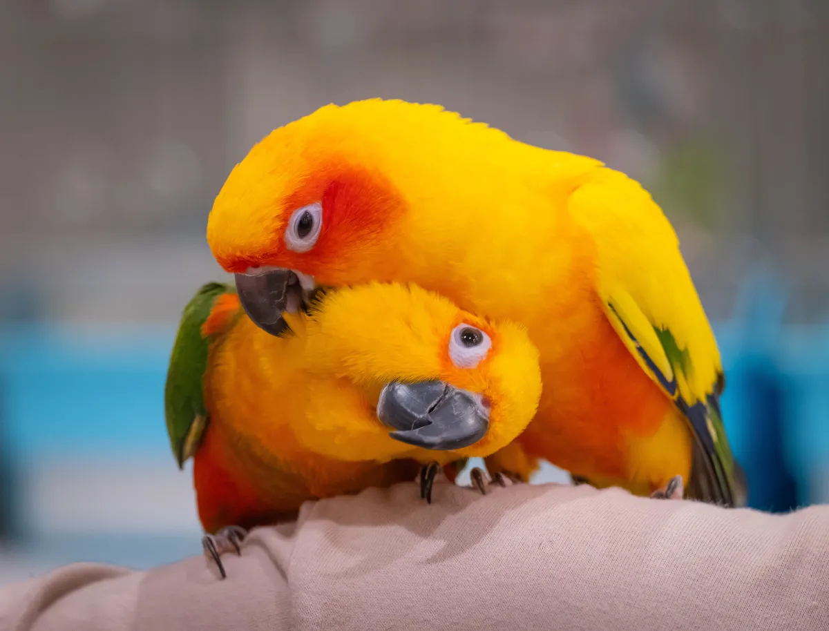 最近、このカフェに新たに仲間入りしたのが、コガネメキシコインコの「うめ」とナナイロコガネメキシコインコの「なな」です。「うめ」は鮮やかな黄色の羽が特徴で、顔周りの明るいオレンジが目を引きます。好奇心が旺盛で、常に周囲に興味を持っている子です。