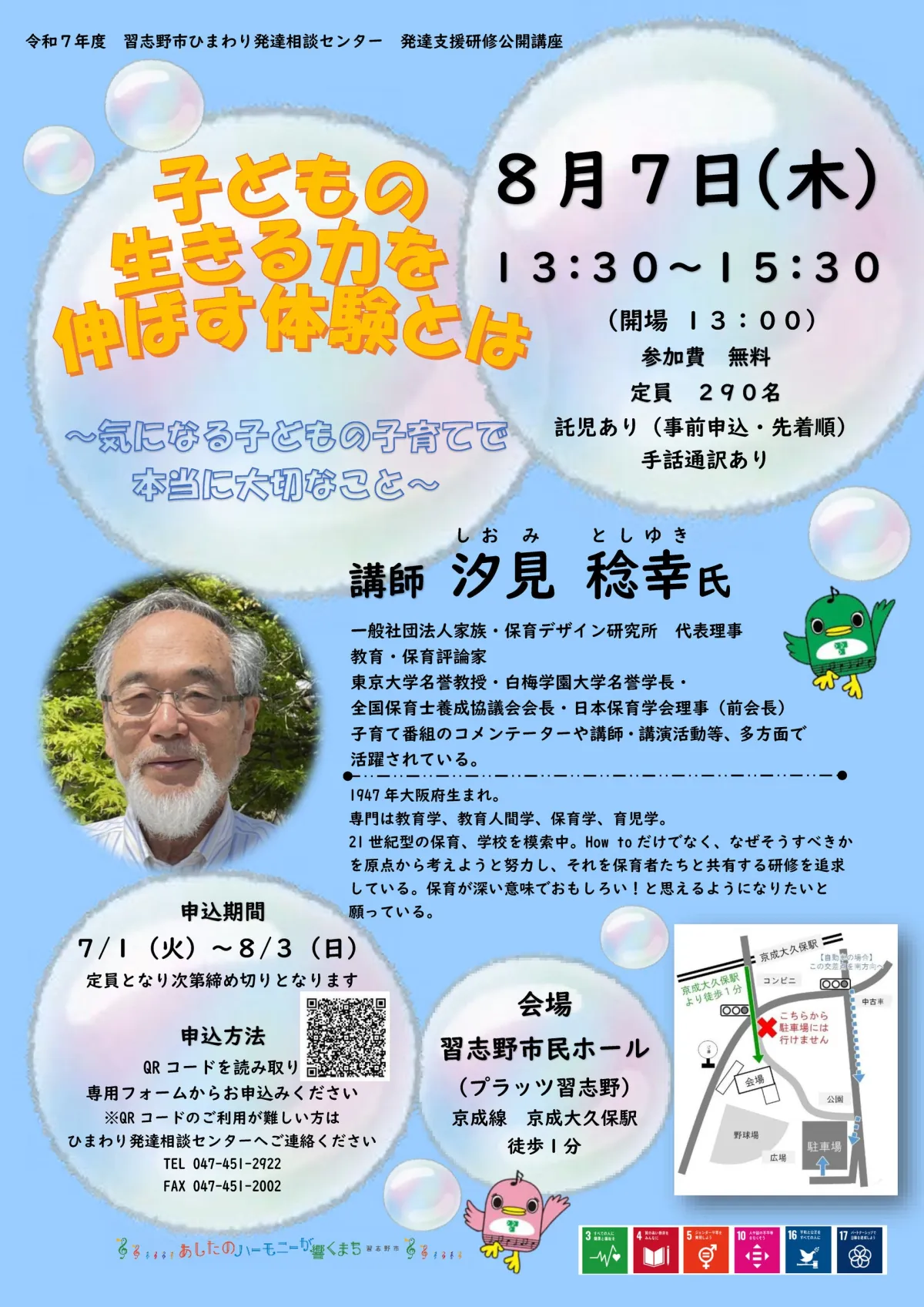 講座の講師には汐見稔幸氏が招かれます。汐見氏は教育や保育に関する評論家であり、数々の著名な役職を歴任されています。東京大学の名誉教授や白梅学園大学の名誉学長を務め、全国保育士養成協議会の会長としても知られています。また、子育て関連のテレビ番組に出演し、幅広い知識と経験をもとに子育てに関する情報を発信しています。