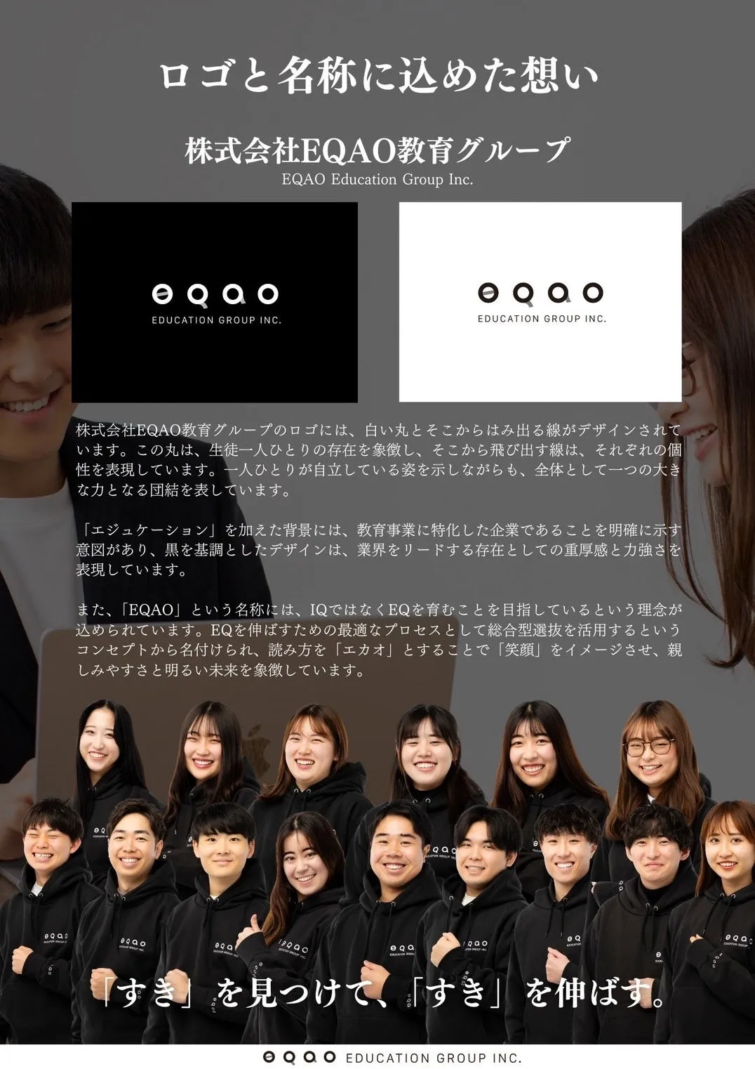 新たに「エジュケーション」という言葉を取り入れた背景には、教育ビジネスに特化した企業であることを明確にする意図があります。また、黒を基調とした色使いは、業界をリードする存在としての力強さを表現しています。EQAOという名称には、IQだけでなくEQ(感情的知性)を育んでいくという理念が含まれています。