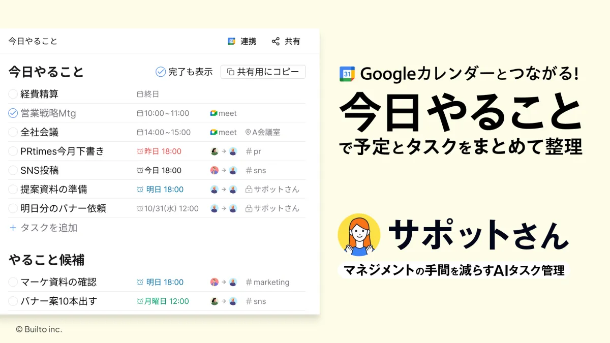 現在、ビジネスの現場では情報の分散化が進行し、効率的なマネジメントが求められています。特に、SlackやGoogleカレンダーといった多様なツールが活用される中、タスクの管理が煩雑になりやすいのです。そんな中、株式会社BuiltoのAIサポーター「サポットさん」は新機能「今日やること」を導入し、業務の効率化を目指しています。