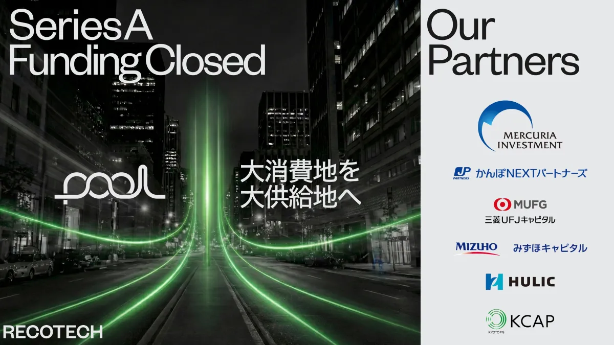 資源循環を支援するプラットフォーム「pool」を展開するレコテック株式会社(本社:東京都千代田区)が、シリーズAの資金調達を発表しました。本ラウンドのリード投資家には株式会社マーキュリアインベストメントが名を連ね、他にかんぽNEXTパートナーズ、三菱UFJキャピタル、みずほキャピタル、ヒューリックスタートアップ、京都キャピタルパートナーズなどの企業が参加しています。
