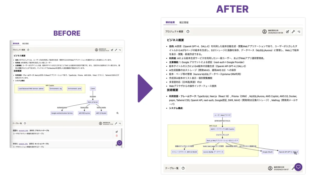 新たに実装されたAIアシスタントは、自然言語処理技術を駆使しており、ユーザーからの質問に対する回答にソースコードの解析を利用します。「この処理はどこにあるのか?」「他のシステムとの連携は?」といった具体的な質問にも、即座に根拠をもって対応できるため、特にプロジェクトの複雑さを軽減する効果が見込まれています。