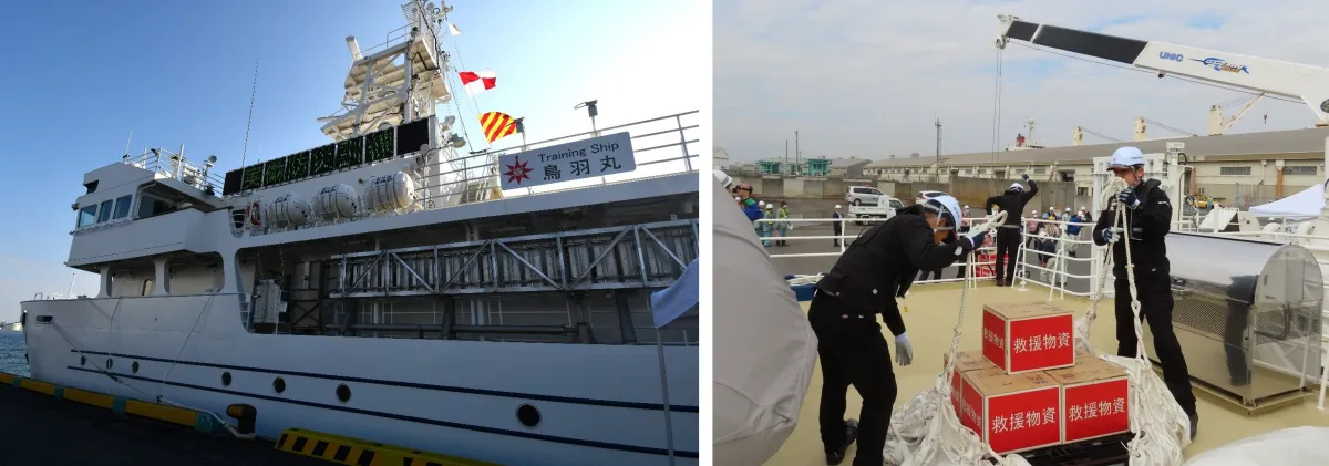 今回の訓練では、鳥羽丸の船内に災害対策本部を設置し、学生ホールや操舵室を利用して「洋上対策本部」としての役割を確認しました。また、訓練では四日市海上保安部の巡視艇「あおたき」と連携し、伸縮クレーンを使用しての緊急物資の輸送訓練も行われました。この訓練により、実際の災害時における物資輸送の流れを確認し、課題を洗い出すことができました。
