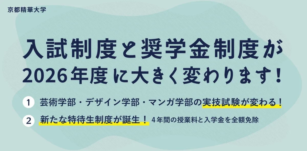 2026年度に向けて、京都精華大学(京都市左京区)は入試制度の改定と新たな特待生制度を設けることを発表しました。これにより、多様な才能を持つ受験生に対し、より多くの学びの機会を提供することを目指しています。