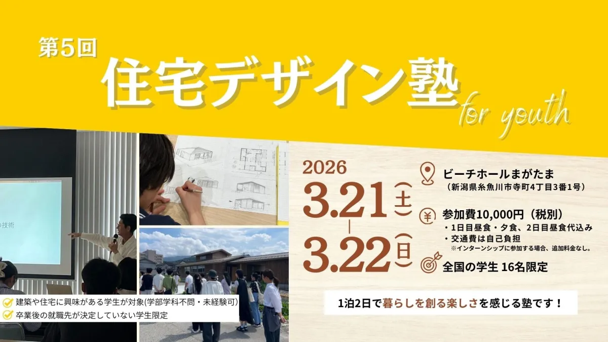 2026年3月21日(土)〜22日(日)、新潟県糸魚川市にて、株式会社カネタ建設が主催する「第5回 住宅デザイン塾 for youth」が開催されます。この塾は、全国の学生を対象とした実践型のワークショップで、建築デザインの楽しさや意義を体験しながら学べる貴重な機会です。