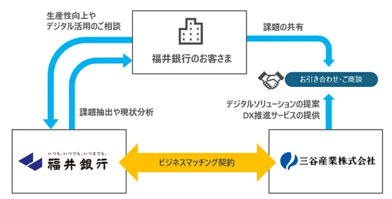 このビジネスマッチング契約により、福井銀行の顧客企業に対して、三谷産業が持つ多様なソリューションを提案することになります。すでに福井銀行グループの福邦銀行や福井ネットとの契約もあり、これによりお互いのアライアンスが一層強化されます。