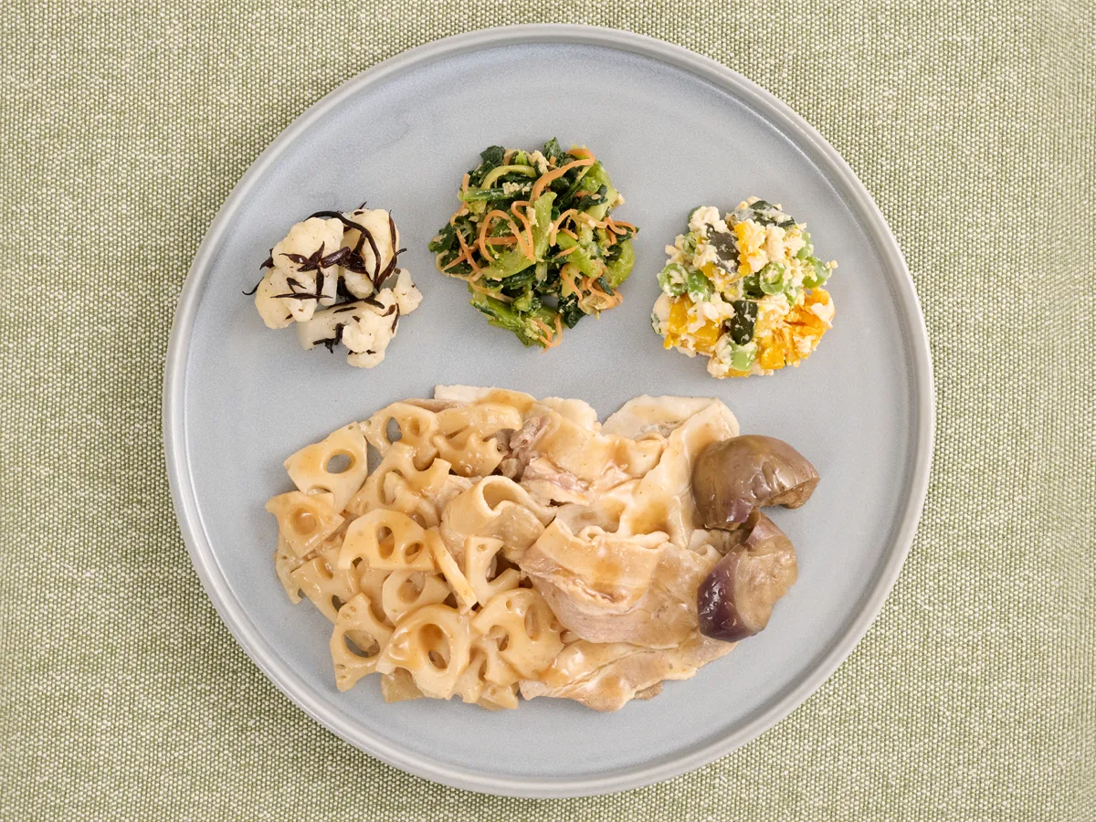 この料理には、いくつかの本格的な副菜も付いています。ひじきとカリフラワーの和え物、鶏肉を加えた小松菜の生姜醤油、また甘みが引き立つかぼちゃとインゲンの白和えなどです。これらの副菜が、主菜の味わいを引き立て、栄養面でも満足感を高めてくれるでしょう。