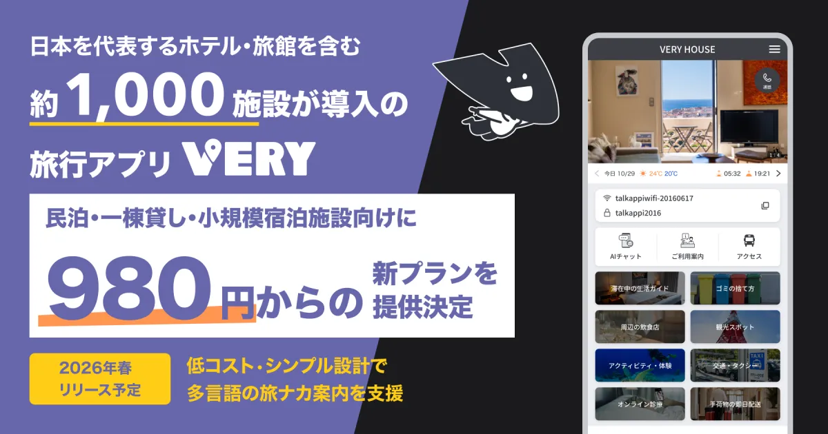 株式会社アクティバリューズが手掛ける旅行アプリ「VERY」は、この度民泊や小規模宿泊施設向けの新プランを、月額980円から提供することを決定しました。今回のプランは、約1,000の宿泊施設に導入されている「VERY」の機能を生かしながら、特に小規模施設に特化したシンプルな設計が特徴です。