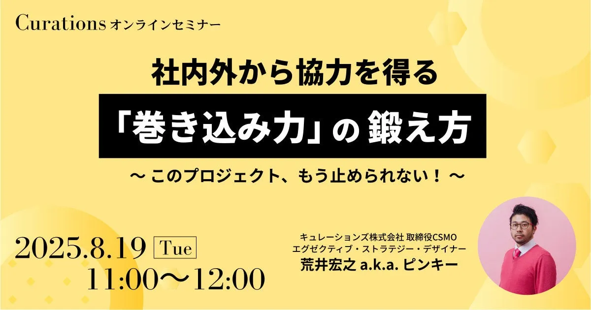 2025年8月19日(火)11:00から、キュレーションズ株式会社が無料のオンラインセミナーを開催します。そのテーマは「社内外から協力を得る『巻き込み力』の鍛え方」です。このセミナーでは、ビジネスプロジェクトを成功に導くために必要な協力者を得るための戦略的アプローチを学ぶことができます。