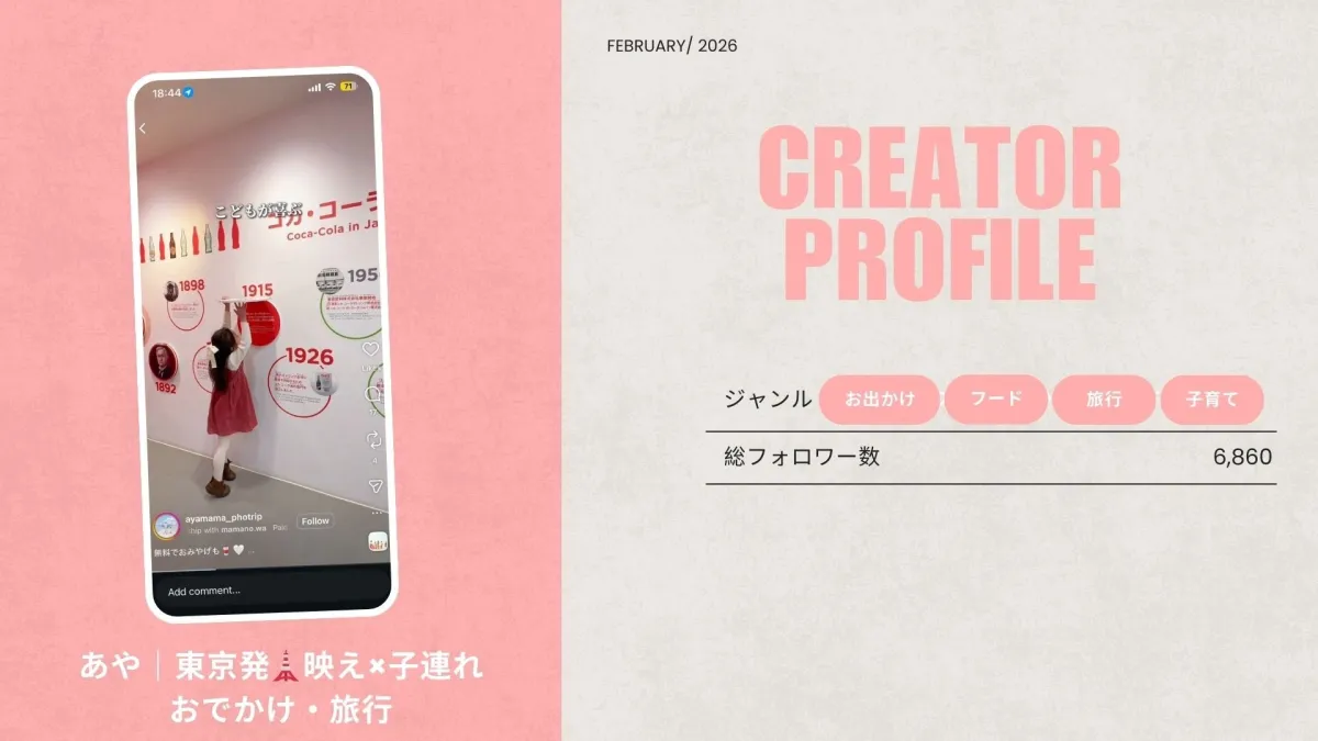 「あや」とは、子連れでも楽しめるおでかけの情報を発信しているInstagramアカウントで、フォロワーの数は約6,860人。また、その投稿の中には再生回数が900万回を超える人気動画も存在します。これにより、子育て世代からの注目を集め、ブランドやスポットの認知を広げています。