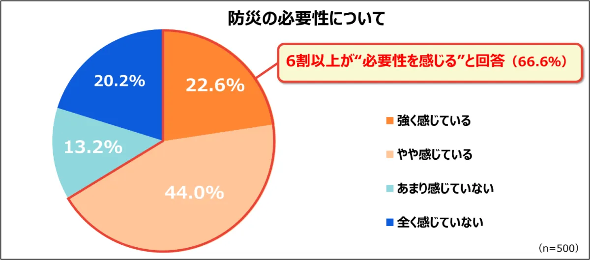 調査では、「強く感じている」と答えた人が22.6%、「やや感じている」が44.0%であり、合計の66.6%が防災の必要性を感じているとしています。しかし、30%以上の人が「あまり感じていない」または「全く感じていない」と回答しており、防災意識には個人差があることも浮き彫りになりました。