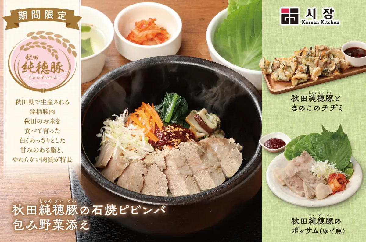 韓国料理専門店「Korean Kitchen Shijan(シジャン)」では、2025年10月1日から11月30日までの期間限定で、秋田県の名物ポーク「秋田純穂豚」を使用した石焼ピビンバを楽しむことができます。この商品は、あっさりとした甘みのある脂肪と柔らかな肉質が特徴の秋田純穂豚と、店舗仕込みのナムル、特製ピビンジャンが絶妙に絡み合い、二つの食べ方で楽しめる一品です。
