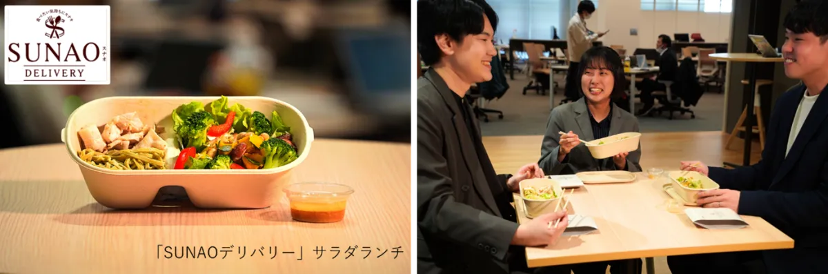 「SUNAOデリバリー」は法人向けの食事デリバリーサービスで、管理栄養士が監修した栄養価の高いバランスのとれたランチを提供します。毎日異なるメニューが用意され、社員は589円(税込)で手軽に利用できるため、コストを気にせず健康的な選択が可能になります。