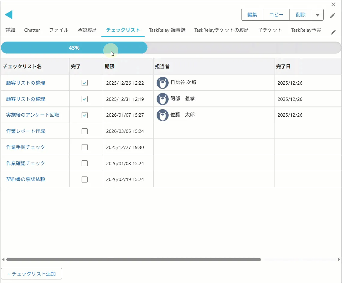 - - チケット単位で管理:各チケットにチェックリストが紐付けられ、業務の進捗をスムーズに確認できます。