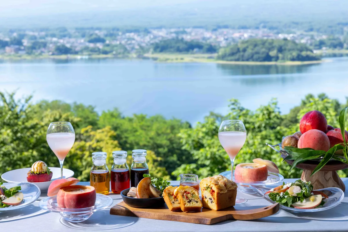 朝食が提供されるのは、河口湖の美しい景色が広がるテラス付きのキャビンです。標高800〜900mに位置するため、立ち込める清涼感があり、夏の暑さを忘れさせてくれます。プライベートな空間でゆったりと過ごしながら、専任のスタッフからは、地元生産者のこだわりや、桃の栽培方法についての話を聞くこともでき、ただ食べるだけでなく、桃にまつわるストーリーを楽しむことができます。