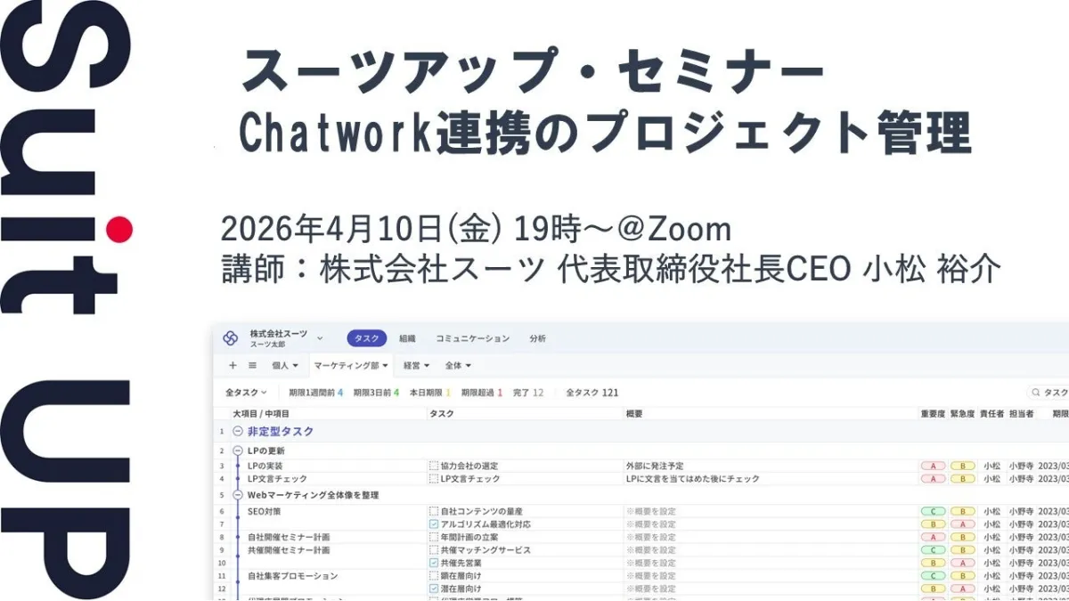 株式会社スーツは、2026年4月10日(金)19時から、オンラインで無料のセミナー「Chatwork連携のプロジェクト管理」を開催します。このセミナーでは、当社の代表小松裕介が講師をつとめ、企業の生産性を向上させるためのプロジェクト管理術を紹介します。