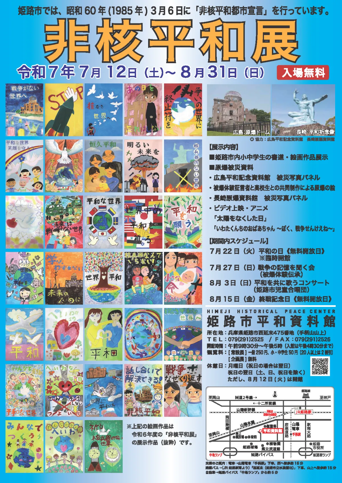 - - 若者の思い:姫路市の小・中学生、高校生が表現した平和への思いを示す書道や絵画作品が約270点展示され、次世代へのメッセージが込められています。