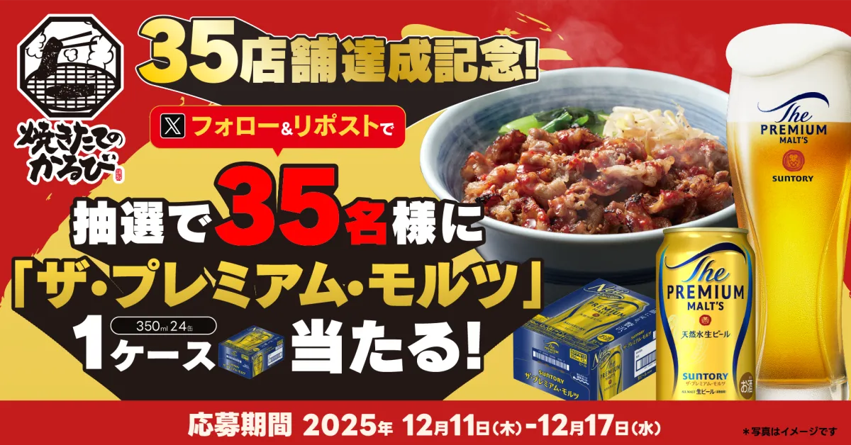 「焼きたてのかるび」35店舗達成を記念し、抽選で35名の方に「ザ・プレミアム・モルツ」が贈られます。参加者は、公式Xアカウントをフォローし、特定の投稿をリポストすることで応募が可能です。キャンペーンの詳細は以下の通りです。