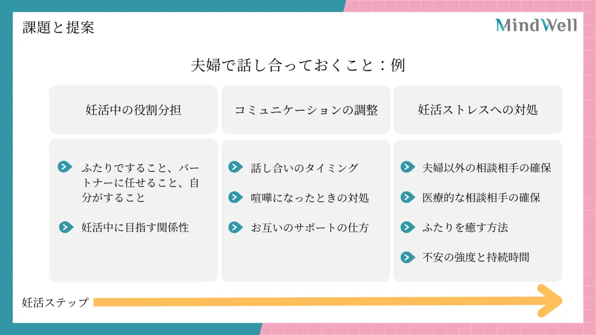 この取り組みの一環として、マインドウェル株式会社は臨床心理士と公認心理師によるオンラインカップルセラピーを4回実施しました。セミナーの参加者は、その前後に心理的評価やアンケート調査を受け、妊活中の夫婦が抱える課題とその解決法について話し合いました。