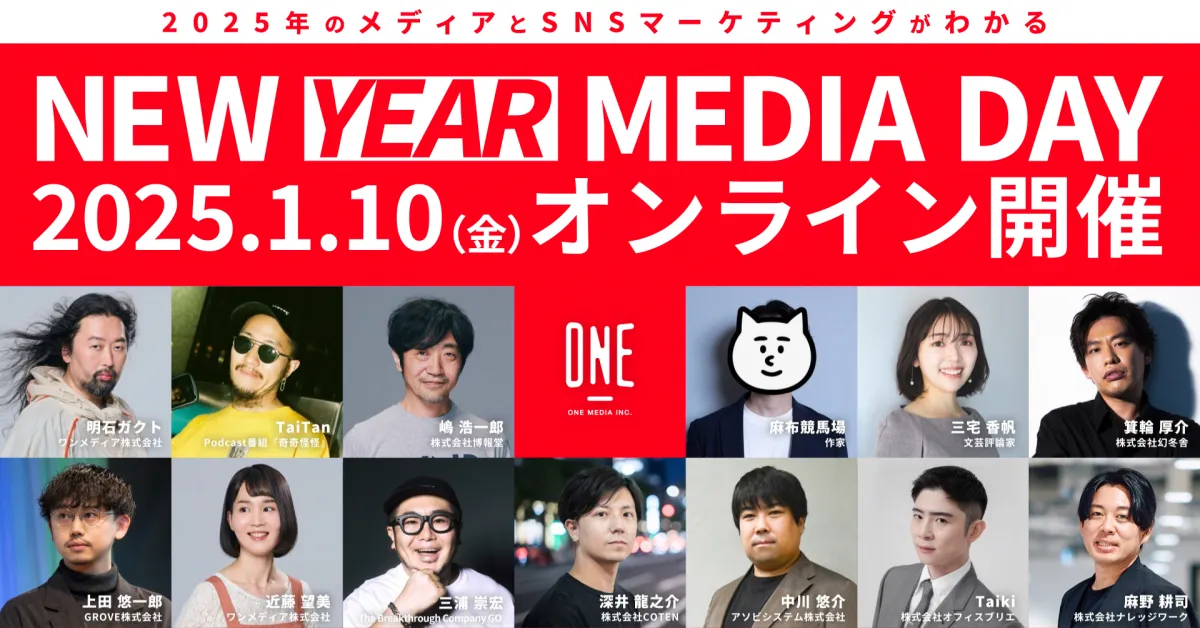 ワンメディア株式会社(本社:東京都渋谷区)は、2025年のメディア動向を探る無料ウェビナー『NEW YEAR MEDIA DAY』を2025年1月10日(金)12時から開催します。このイベントは500名限定で、参加費は無料。事前の申し込みが必要です。