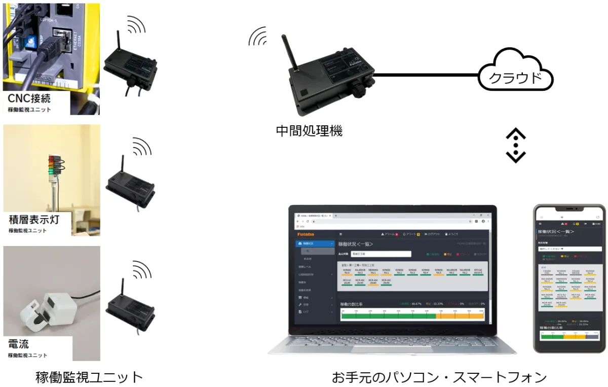 さらに、稼働監視ユニットには、CNC検知、積層表示灯検知、電流検知の3つのタイプが用意されており、工作機械の種類やメーカー、年式に関係なく幅広く使用可能です。初めて導入される方でも、視覚的に情報を把握できるように、パソコンやスマートフォンからクラウドシステムに簡単にアクセスできます。稼働状況や稼働率、工場ごとのデータはグラフィカルに表示され、日別・月別のデータや目標達成状況など、さまざまなメニューが提供されます。