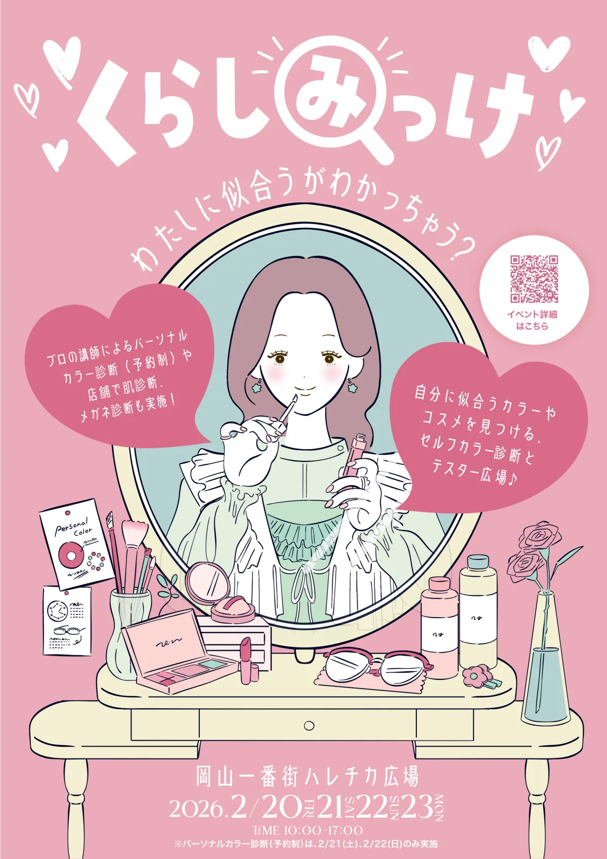 2026年2月20日(金)から2月23日(月・祝)、岡山駅直結のショッピングセンター「岡山一番街・さんすて岡山」にて、「くらしみっけ~わたしに似合うがわかっちゃう?~」が開催されます。このイベントは、多彩な「くらし」の楽しさを発見し、似合うものを見つけることを目的としています。好評だった第2弾に続いて第3弾を迎えるこのイベントは、参加者自身が自分にぴったりな色を見つけることができる魅力的なプログラムが満載です。