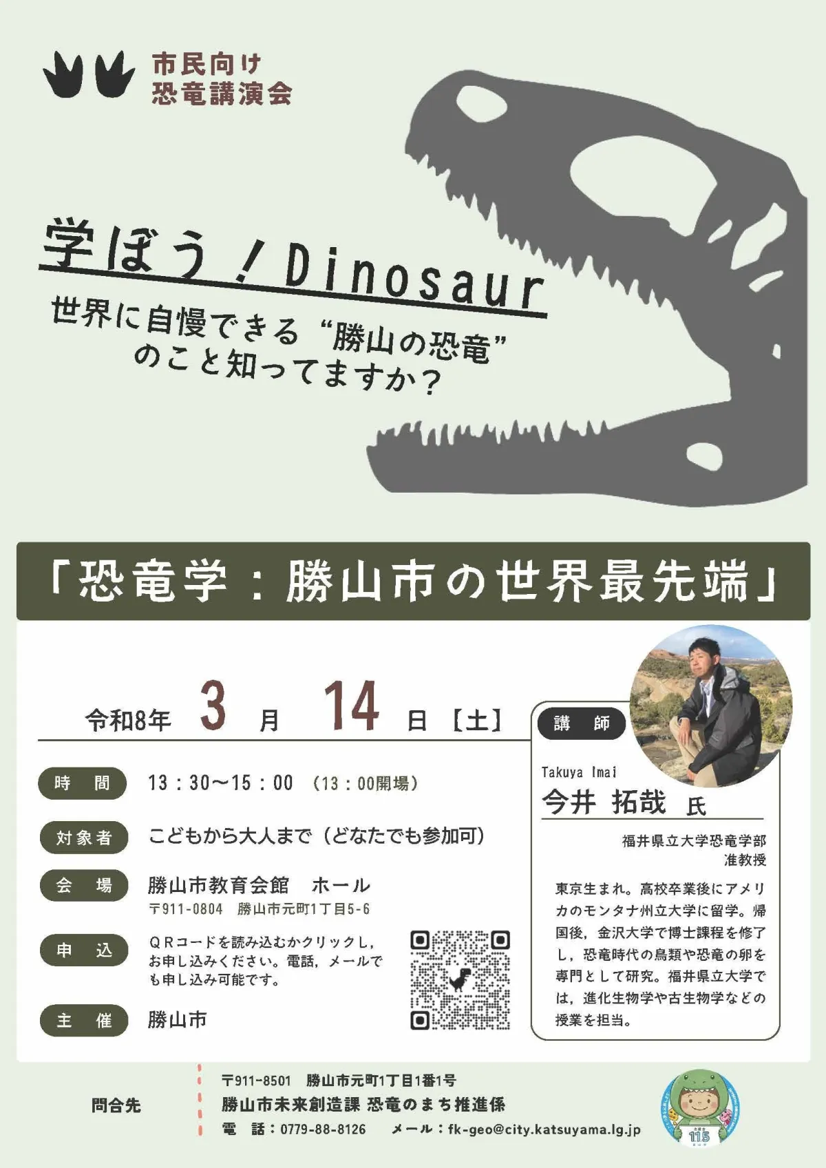 講演会「学ぼう!Dinosaur」は、勝山市の魅力を再発見し、地域社会への理解を深める絶好のチャンスです。恐竜好きはもちろんのこと、地域に住む皆さまにとっても、いかに恐竜が勝山市に深く根付いているのかを知り、楽しむ良い機会になることでしょう。ぜひ、皆様のご参加をお待ちしております。
