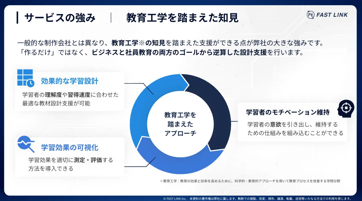 FAST LINKのサービスの大きな特徴は、単なる制作代行にとどまらず、受講生と共同で教育設計を進めていく「Done With You」の理念に則っているところです。このアプローチにより、お客様は専門的な知識を深めつつ、社内で教育を回す人材も育成できます。