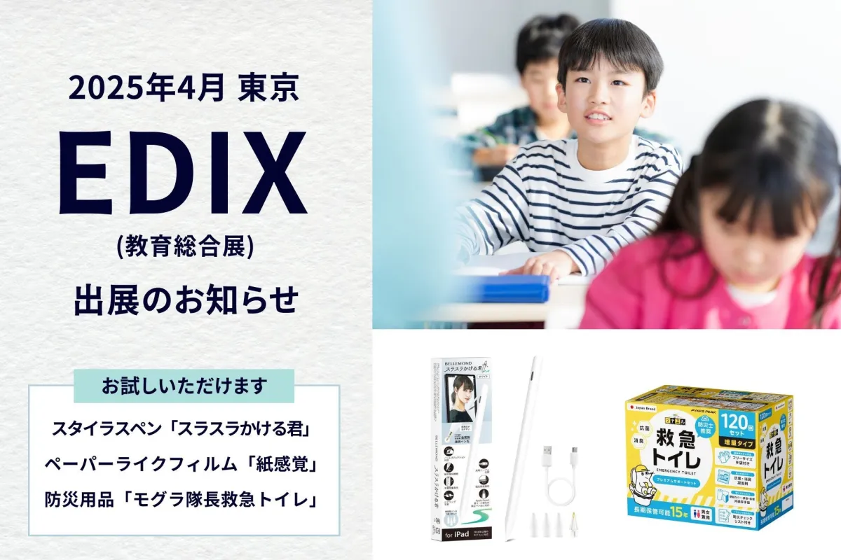 2025年4月23日から25日にかけて、東京ビッグサイトで開催される「第16回 EDIX(教育総合展)東京」に、Fun Standard株式会社が出展します。このイベントでは、教育現場でのICT活用を支えるタブレット関連製品と、非常時に役立つ防災トイレを紹介します。