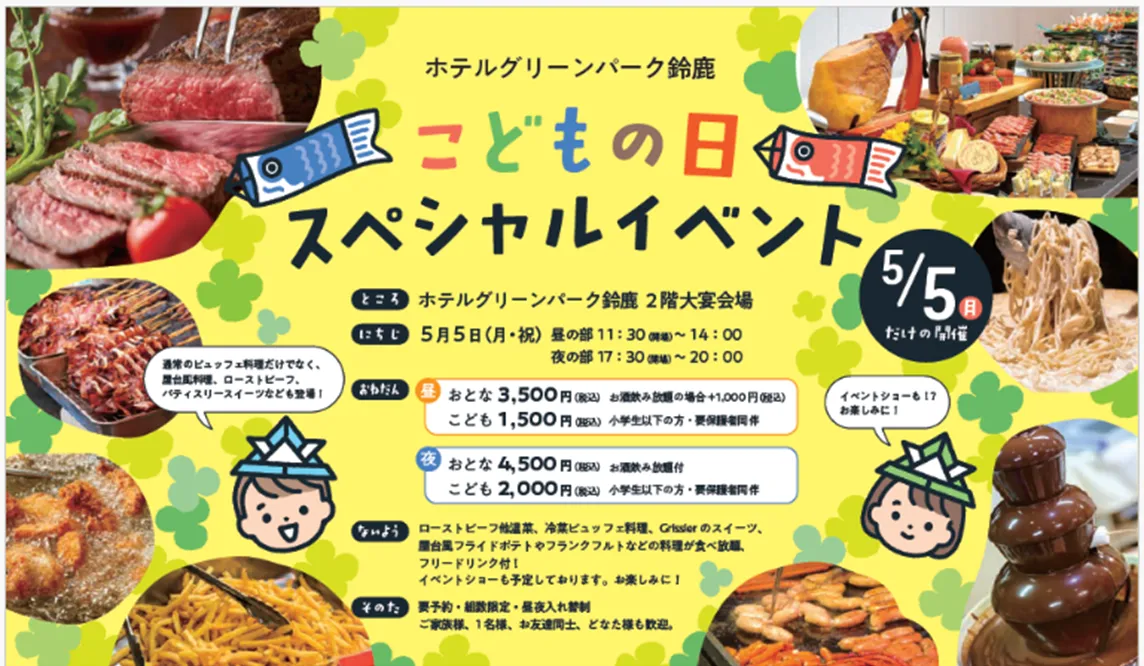 2025年5月5日(月・祝)、三重県鈴鹿市に位置するホテルグリーンパーク鈴鹿にて、「こどもの日特別ビュッフェ」が開催されます。このイベントでは、家族全員が楽しめる美味しい料理や楽しいアトラクションが盛りだくさん。子どもたちの健やかな成長をお祝いするこの日は、笑顔あふれる素晴らしいひと時となることでしょう。