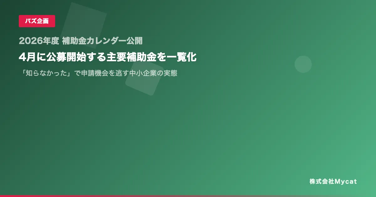 2026年度の補助金公募が近づいてきました。中小企業や小規模事業者が活用できる各種補助金が、毎年4月より順次公募を開始します。しかし、全国の中小企業の中には、その存在を知らないまま機会を逃しているところが少なくありません。これを受けて、株式会社Mycatが提供する「補助金AI」が独自に集計した2026年度の補助金スケジュールを公開しました。このカレンダーは、確認しやすい一覧形式で、補助金を最大限に活用するための強力なツールです。