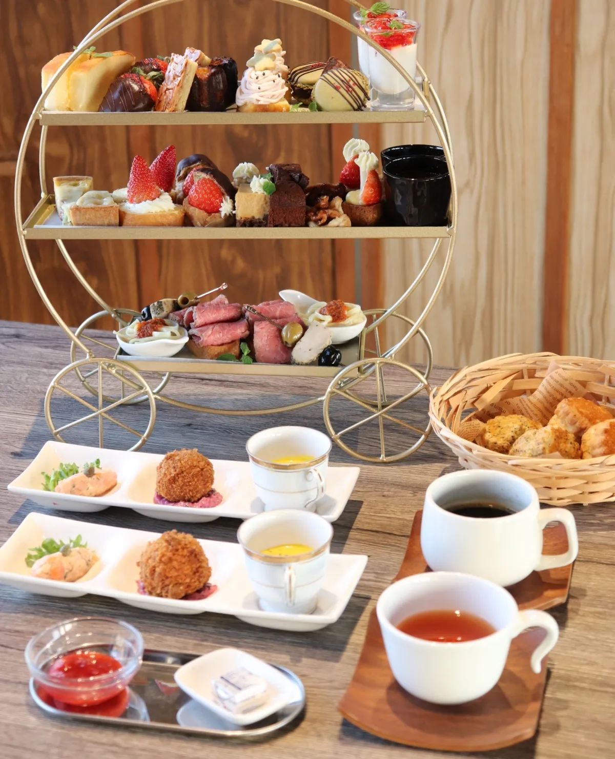 このアフタヌーンティーセットは、ドリンク付きで3,300円とお手頃な価格。珍しいコーニシュパスティやスープなどのアミューズから始まり、さらに手作りのスコーンやローストビーフのオープンサンドといったセイボリーまで充実しています。デザートセクションには、奈良県産のイチゴをたっぷり使ったパウンドケーキやタルト、特製クレーム・ブリュレなどが並び、思わず目を奪われる贅沢なラインナップです。日本の春の訪れを感じさせるこのセットで、心地よいお茶のひとときをお楽しみ下さい。