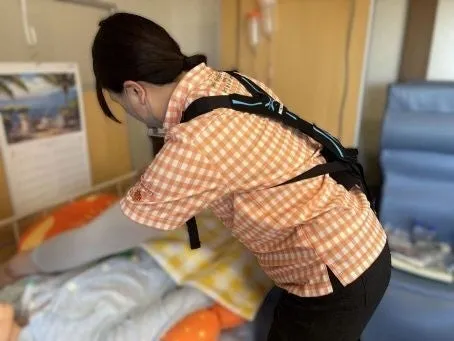 そこで、陽なたスマイルケアでは職員の負担を軽減するため、アシストスーツの導入を決定しました。様々な候補から、最終的にイノフィス社の『マッスルスーツ Soft-Power』に辿り着きました。このスーツは、軽量で装着が容易なことから、高い評価を得ており、日常使用でも負担にならない設計がされています。実際にスーツを着用したヘルパーは、「姿勢を維持しやすく、特におむつ交換や体位変換時の腰の負担が大幅に減った」と報告しています。
