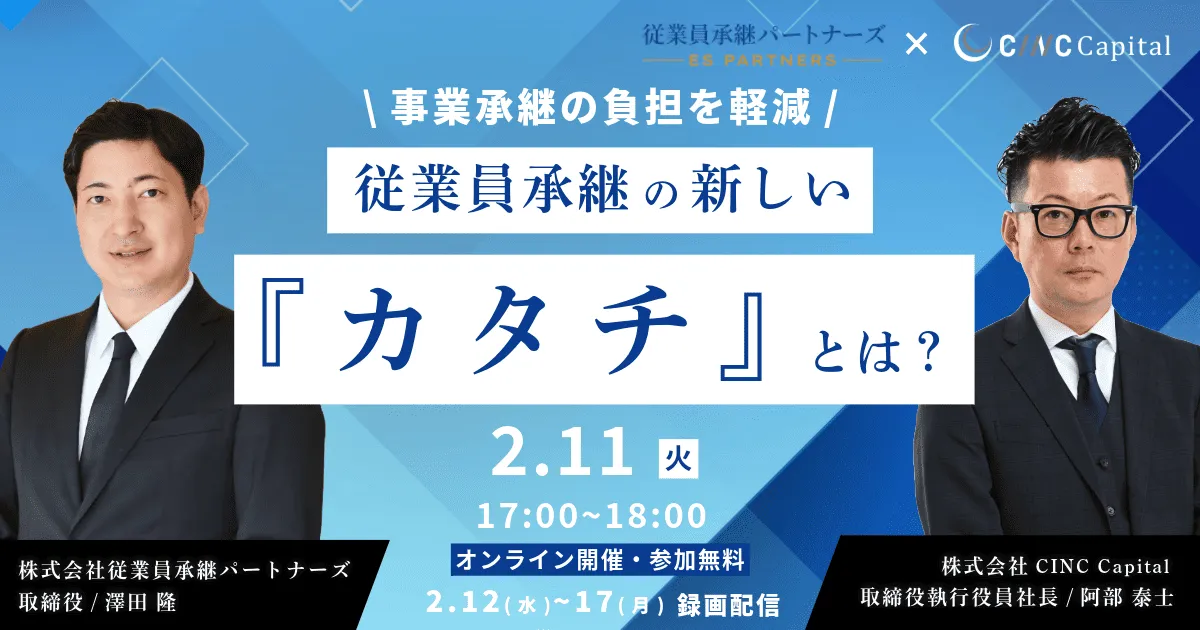 株式会社CINCの子会社であるCINC Capitalが、経営者向けのセミナーを開催します。その名も『事業承継の負担を軽減!従業員承継の新しい「カタチ」とは?~M&Aと徹底比較~』。多くの経営者が直面している後継者問題や事業の継続に関する課題に光を当てる内容となっています。