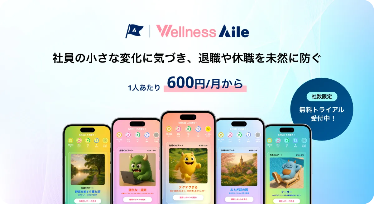 「Wellness Aile」のリニューアルを記念して、法人向けに無料トライアルを実施します。3週間のトライアル期間中には、アプリの各種機能を実際に体験することができ、運動量や気分の記録、AIアート機能を通じて自分の健康状態をより深く理解することが可能です。参加企業は、1社あたり最大5名まで登録可能です。