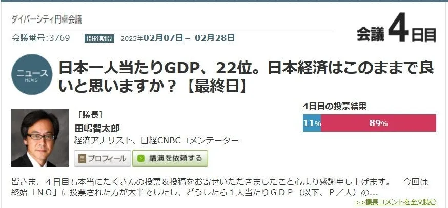 今回の円卓会議では、「日本の一人当たりGDPがOECD加盟国中22位である現状を、皆さんはどう思われますか?」というテーマのもと、意見がかわされました。初日の議論では、日本経済の現状に対する様々な意見が寄せられました。田嶋氏は「豊かさの指標としてのGDPに関する見解をお聞かせください」と問いかけます。
