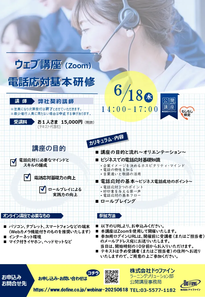 電話応対に苦手意識を抱えているビジネスパーソンへ、特別なトレーニングの機会を提供いたします。2025年6月18日(水)、株式会社ドゥファインが主催する「電話応対基本研修」がZoomを通じて行われます。本講座では、電話応対の基本スキルをしっかりと実践的に学び、自信を持って電話に臨めるようサポートします。