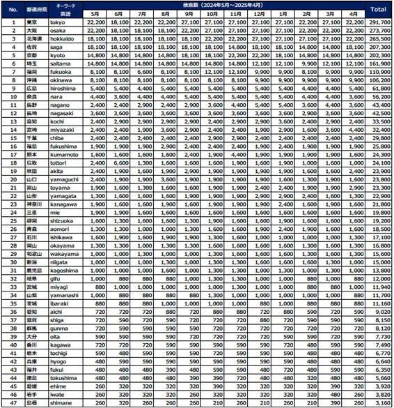 2024年5月から2025年4月の期間で、マレーシアにおける日本の都道府県検索数ランキングが発表されました。1位は東京、続いて大阪、北海道が続いています。特に興味深いのは、5位に京都、7位に福岡、8位に沖縄がランクインしている点です。