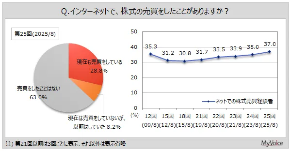 調査結果によると、ネットで株式を売買している人は、全体の約31.9%にあたります。その中で、現在も取引を行っている割合は28.8%であり、過去に経験があるものの現在は行っていない人も含めると4割弱に達します。これは、特に若い世代がネット証券に魅力を感じていることを示唆しています。