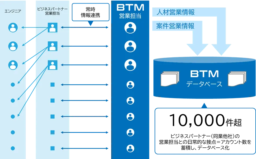 エンジニアリング業界では、案件があっても要件を満たすエンジニアがいなければ受注が難しい場合が多く、他社にその案件を紹介することが一般的です。このため、ビジネスパートナーとの関係を強化することが、業界内の競争力を高める鍵となっています。BTMは、多くのビジネスパートナーを有し、彼らからの案件情報が日々集まっています。