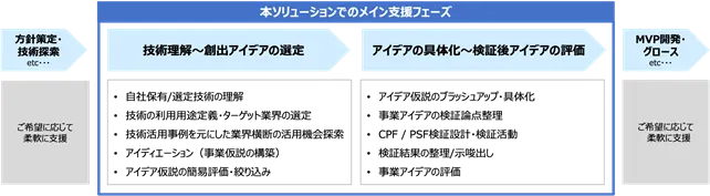 新しいソリューションは、企業の技術を問わず、デジタル技術を基盤にした新規事業化をサポートします。三社の専門知識を集結し、独自のメソッドを用いて新規事業のアイデア創出から立ち上げまでを一貫して支援します。このサービスは、特に事業開発初期フェーズの課題解決に焦点を当てており、技術の選定や用途の探索を通じて新たな事業機会を見つけ出します。