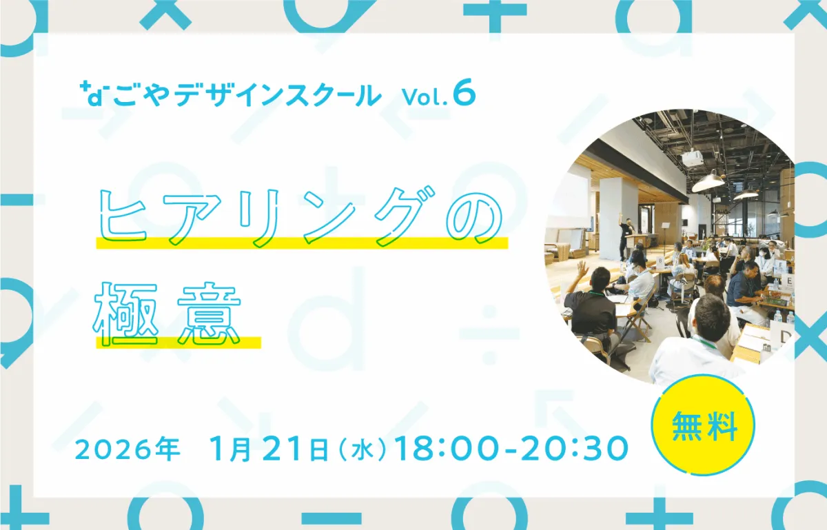 名古屋市中区の国際デザインセンターにて、2026年1月21日(水曜日)に「なごやデザインスクール」の第6回が開催される。このスクールは、ビジネスの現場で必要となるデザイン思考を学ぶための場であり、相互学習を通じて多様な分野の人々が集まり、新しいアイディアや解決策を見いだすことを目的としている。